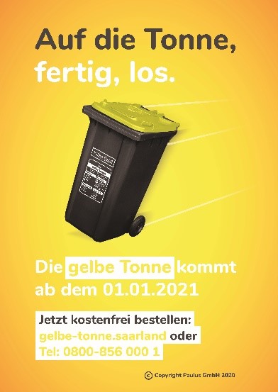 Die gelbe Tonne kann ab sofort über das Online Portal „GELBE-TONNE.SAARLAND“ oder telefonisch bei der Paulus GmbH über die kostenfreie Rufnummer 0800-8560001 die gewünschten Abfallgefäße bestellt werden.