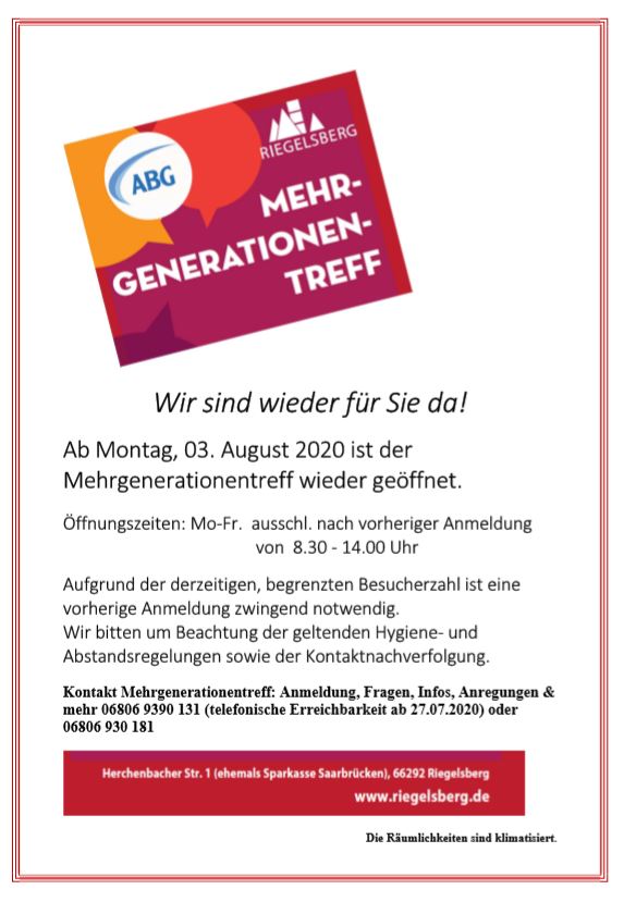 Mehrgenerationentreff, Tel. 06806/9390131, Herchenbacher Str. 1, (ehemaligen Sparkasse Saarbrücken), 66292 Riegelsberg, oder Rathaus Riegelsberg, 06806/930181, kultur@riegelsberg.de
