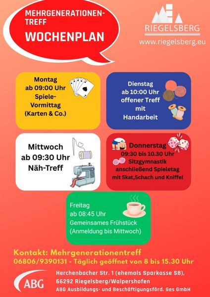 Und nicht vergessen – an allen Tagen gibt es zu dem Wochenprogramm den offenen Treff. Also auch ohne Teilnahme an einer Aktion oder Aktivität kann der Mehrgenerationentreff täglich besucht werden.