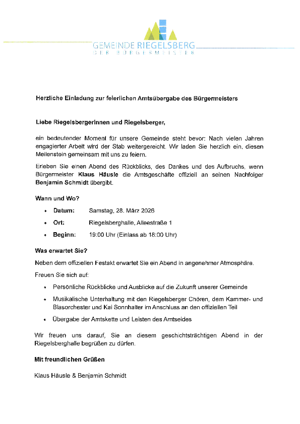 Darüber hinaus werden alle weiteren Interessentinnen und Interessenten gebeten, ihre Bewerbung (Motivationsschreiben) bis zum 30. April 2026 schriftlich an die Gemeinde Riegelsberg, Saarbrücker Straße 31, 66292 Riegelsberg, zu richten.